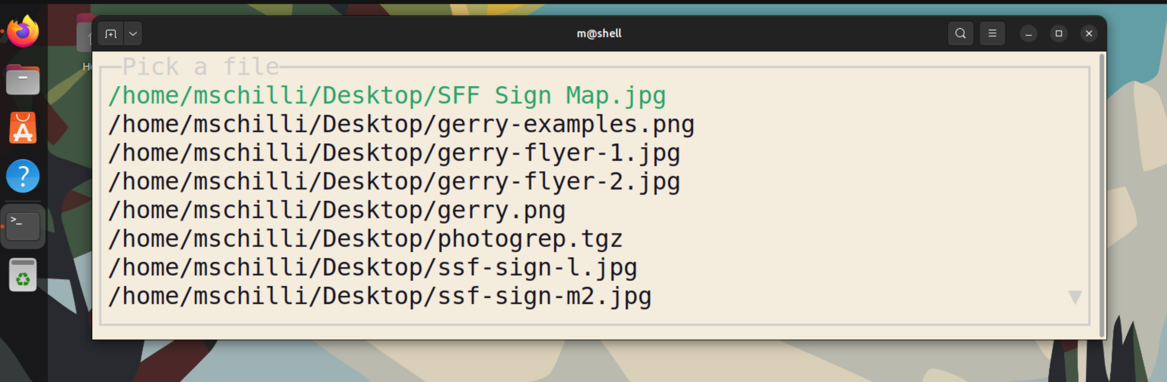 verbirgt. Ein Bild sagt mehr als tausend Worte! Eine Terminal-UI kann keine Bilder anzeigen, aber eine Fyne-GUI in einem zusätzlich hochschnellenden Applikationsfenster schon. Und den Pfad eines dort ausgewählten Fotos kann die Shell ebenfalls in den aktuell bearbeiteten Kommandozeilenpuffer einfügen, also frisch ans Werk!