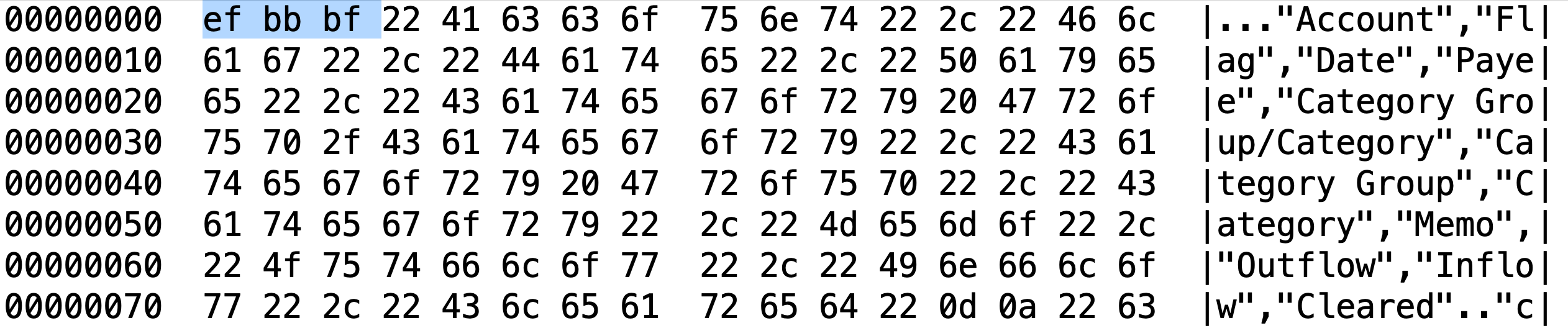 | Abbildung 4: Drei Bytes am Anfang der CSV-Datei setzen die Byte Order Mark (BOM) |
