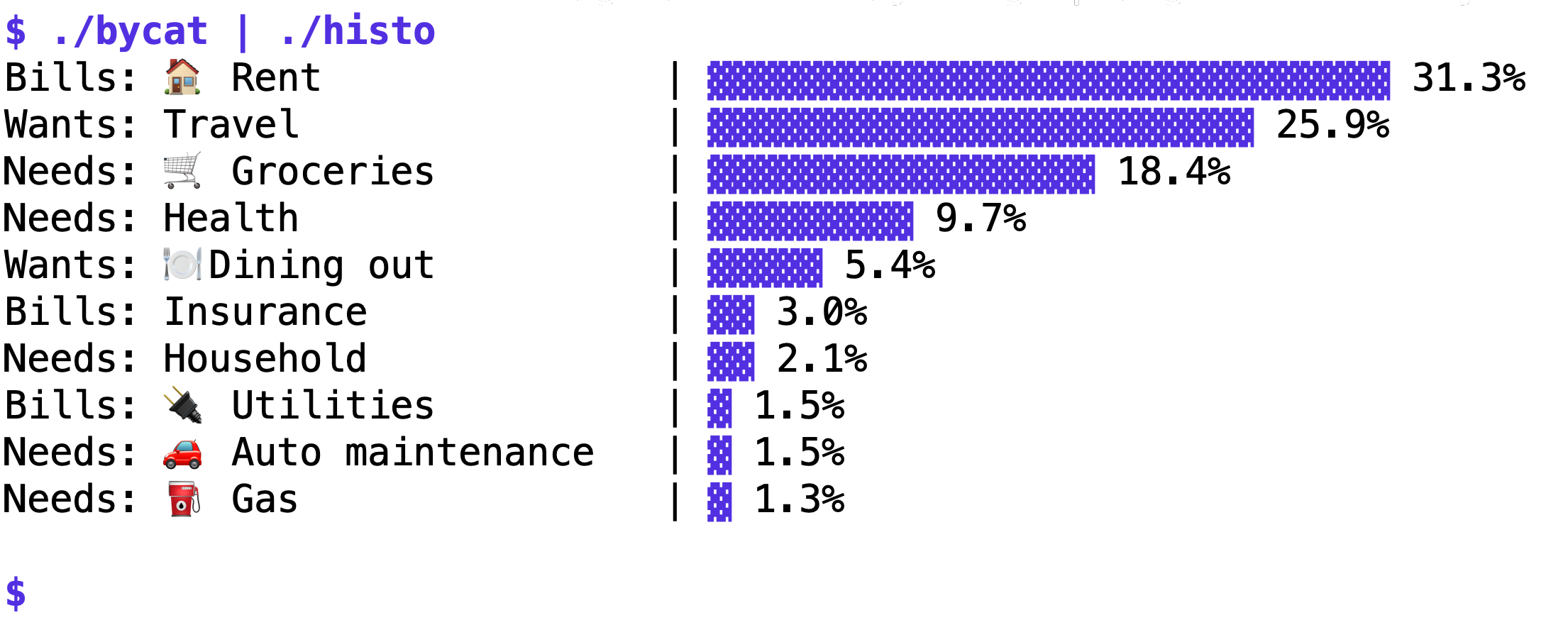 Drögen Zahlenreihen fehlt aber der nötige Pizzazz, deswegen macht Listing 3 ein Histogramm mit Balken daraus. Moderne Unix-Terminals zeigen ja gottlob nicht nur ASCII-Text an, sondern beherrschen auch manches Unicode-Zeichen zum Erstellen von Terminal-UI-Grafiken. Abbildung 5 zeigt die Ausgabe der Top-10 geldverschlingenen Kategorien im Terminal, aufgemotzt mit farbigen Balken und Emojis. Das dazu aufgerufene Kommando bycat ist das Binary, das aus den Listings 2 und 1 mit go build bycat.go csv.go generiert wurde, und seine Ausgabe fließt durch die getippte Pipe ins Programm histo, das die gezeigte Grafik generiert.