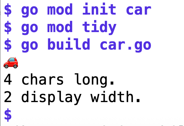 10 fmt.Printf("%d display width.\n", runewidth.StringWidth(car))