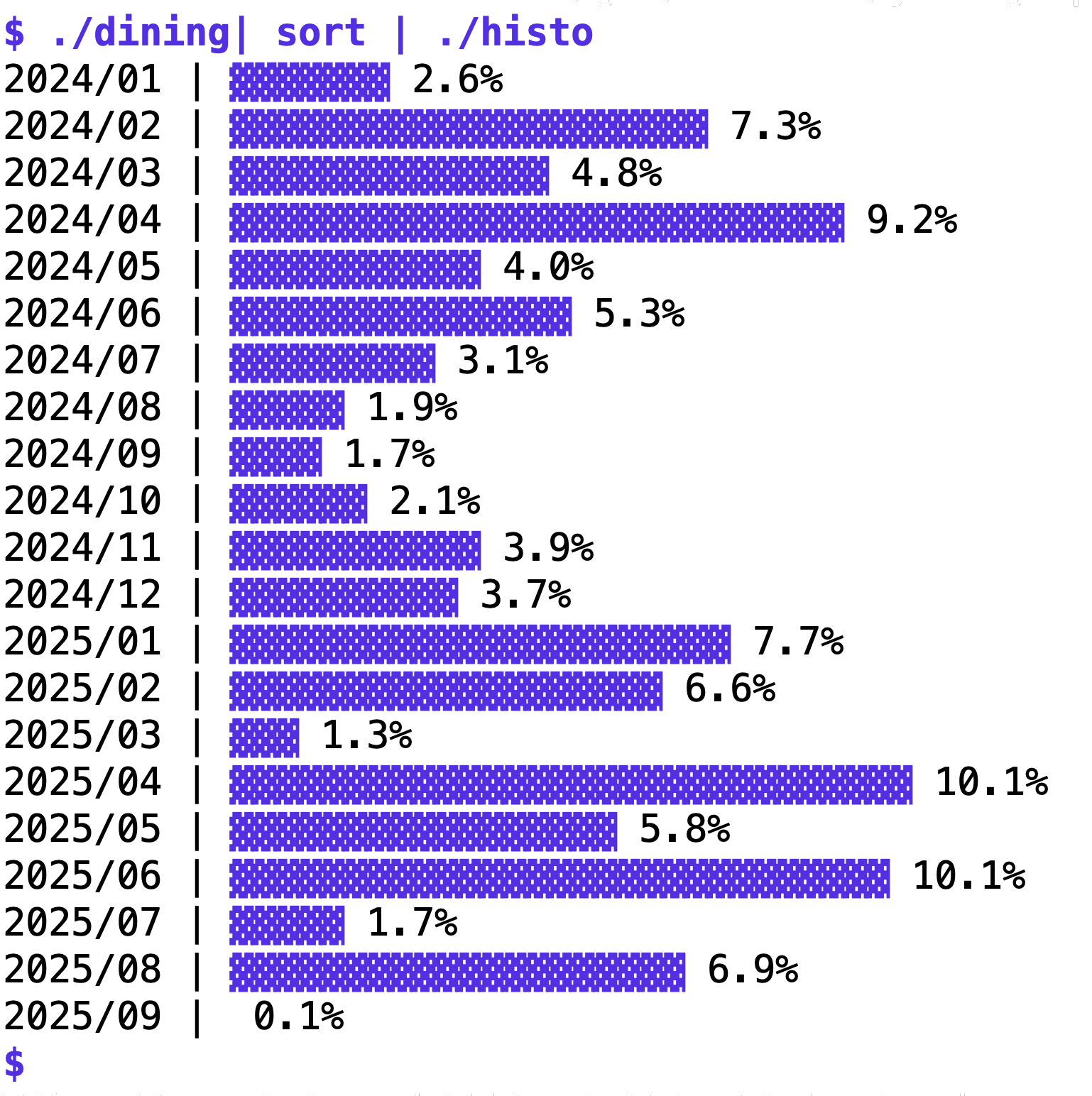 Abbildung 7 zeigt den Aufruf des Binaries dining, gefolgt von einem sort-Kommando der Unix-Shell, gefolgt von histo, dem Binary aus Listing 3. Die Ausgabe zeigt eine kurze Restaurantflaute im Sommer 2024, gefolgt von vermehrten Restaurantbesuchen in der kälteren Jahreszeit. Während Covid wäre sicher auch ein Einbruch erkennbar gewesen, aber da hatte ich Ynab noch nicht.