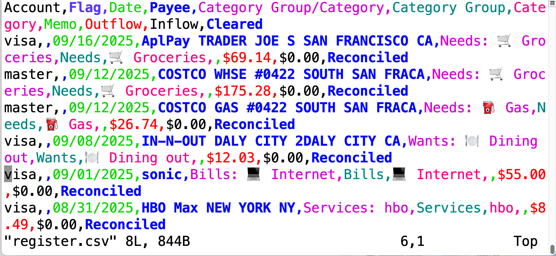 | Abbildung 3: Die CSV-Datei mit den in Ynab registrierten Einzelposten |