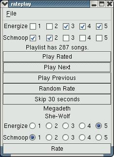 rateplay plays MP3s in two different phases: The training phase and the play phase. During training, it randomly plays songs from a collection and asks the user for ratings on two criteria: The energize and the schmoop level. It stores these ratings persistently in an SQLite database (automatic setup, no fiddling required). During the play phase, it lets the user select acceptable energize and schmoop levels and randomly plays songs matching these criteria.
