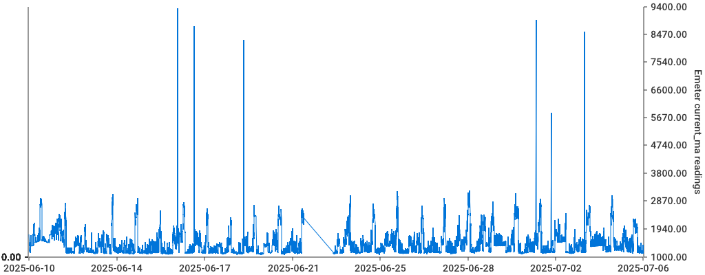 Fällt der Strom aus oder jemand zieht den Stecker, springen die aufkumulierten Wattstunden wie oben gesehen wieder auf Null zurück, und der abgefragte Wert ist plötzlich kleiner als der in der Datenbank abgelegte. Zeile 27 prüft diesen Fall und setzt die Wattstundendifferenz auf Null, damit sie der Graph später einfach ignorieren kann.