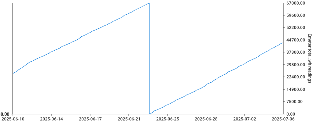 Zum Glück führt der Energiemonitor nicht nur Buch über die gegenwärtig gezogene Leistung, sondern unterhält auch einen Stromzähler ähnlich der der örtlichen Stromversorger. Dieser erhöht einen stetig wachsenden internen Wert, der die bislang verbrauchten Wattstunden anzeigt (Abbildung 9). Zieht jemand den Stecker, fällt der Strom aus, oder ein neuer Tag beginnt, springt der Tageszähler auf Null zurück. Dies gilt es später bei der Auswertung zu berücksichtigen. Hangelt sich der Code durch die Messwerte und will die in einem Zeitfenster verbrauchte Energie ermitteln, muss er prüfen, ob der aktuelle Zählerstand niedriger ist als der letzte gemessene. In diesem Spezialfall ergibt sich der Verbrauch nicht aus der Differenz beider Messwerte, sondern ist über den Daumen gepeilt etwa gleich dem aktuellen Zählerstand.