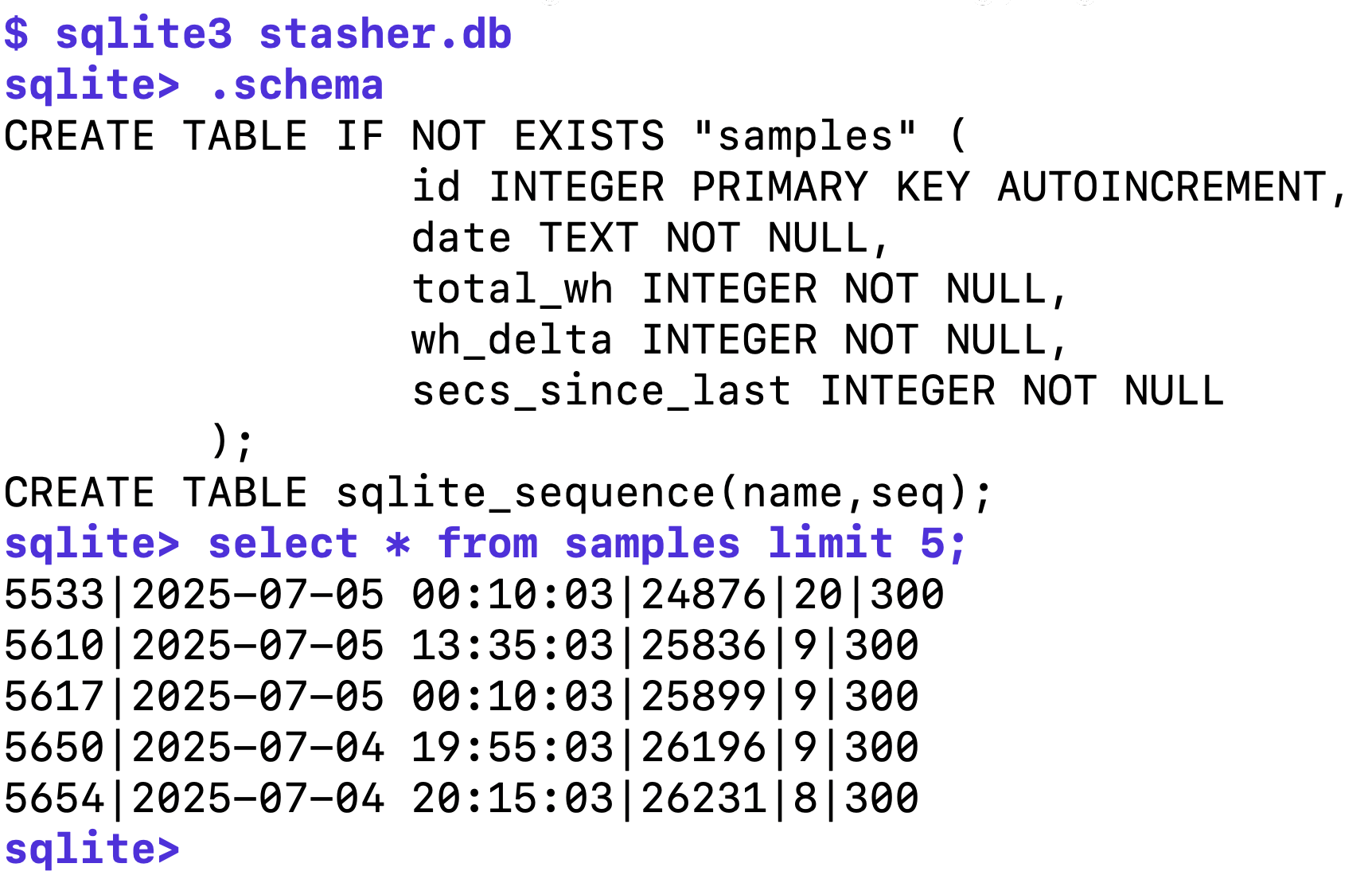 Als Speicher für historische Messdaten soll eine SQLite-Datenbank dienen, mit einer Tabelle, die pro Messung eine Reihe mit dem Datumsstempel und den ausgelesenen Monitorwerten für die während des aktuellen Tages akkumulierten Wattstunden enthält (total_wh
