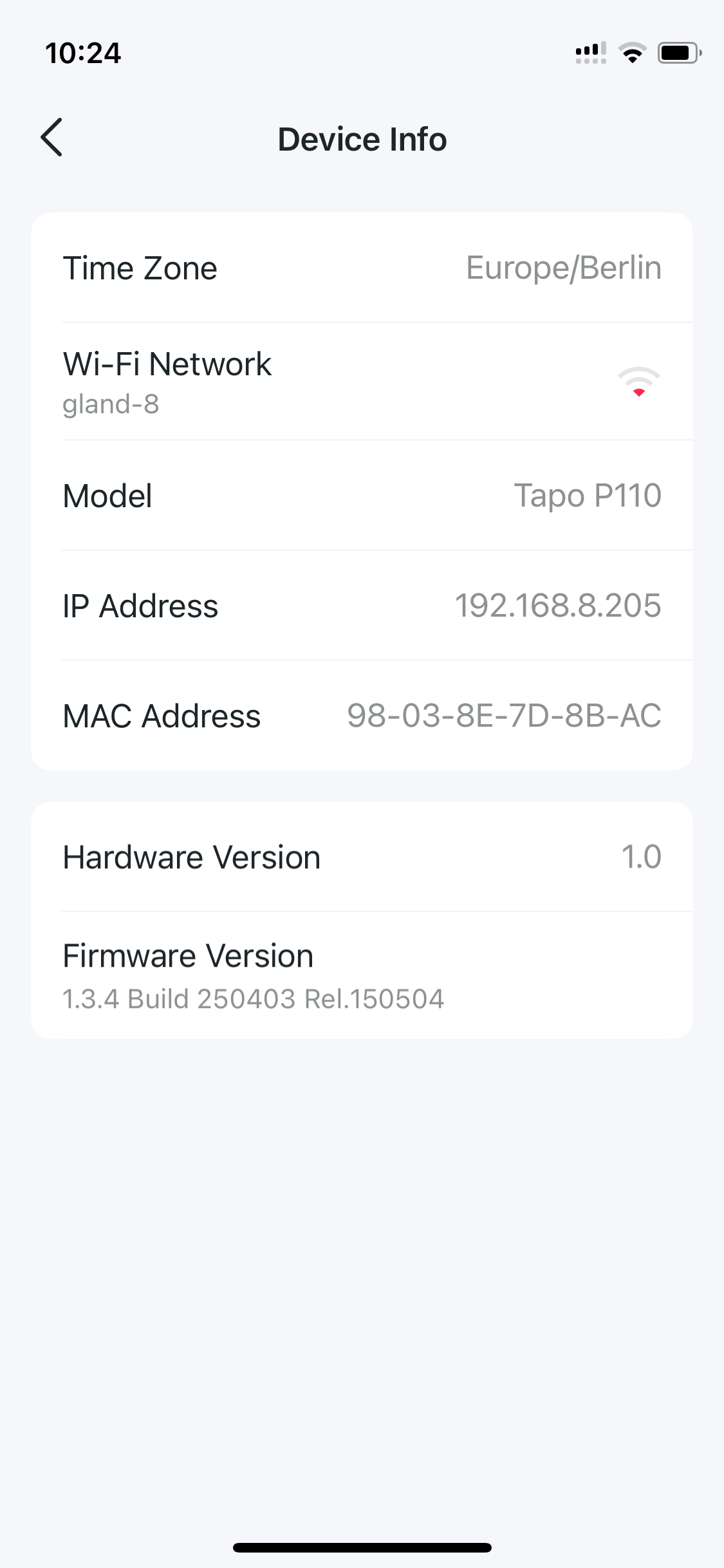 Zwar sind die TP-Link-Stöpsel hauptsächlich für die proprietäre TP-Cloud ausgelegt, aber mit etwas Handarbeit lassen sich die Energie-Messwerte auch lokal über die API des Geräts auf dem WLAN abgreifen. Dazu ist das Gerät zunächst wie gewohnt über die Tapo-App in der Cloud zu installieren (Abbildung 5). Ein Blick in die Sektion "Device Info" offenbart die IP-Addresse, die das Gerät bei der Installation vom DHCP-Server zugewiesen bekam (Abbildung 6).
