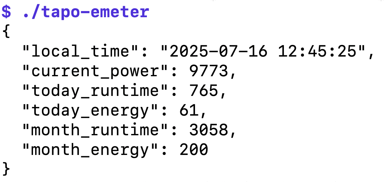 01 package main 02 import ( 03 "fmt" 04 "encoding/json" 05 "github.com/fabiankachlock/tapo-api" 06 "github.com/fabiankachlock/tapo-api/pkg/api/request" 07 "github.com/mschilli/go-murmur" 08 ) 09 func main() { 10 tapoIp := "192.168.8.205" 11 m := murmur.NewMurmur() 12 tapoEmail, _ := m.Lookup("tapo_user") 13 tapoPass, _ := m.Lookup("tapo_pass") 14 client := tapo.NewClient(tapoEmail, tapoPass) 15 device, err := client.P115(tapoIp) 16 if err != nil { 17 panic(err) 18 } 19 resp, err := device.GetEnergyUsage(request.GetEnergyDataParams{}) 20 if err != nil { 21 panic(err) 22 } 23 txt, err := json.MarshalIndent(resp, "", " ") 24 if err != nil { 25 panic(err) 26 } 27 fmt.Println(string(txt)) 28 }
