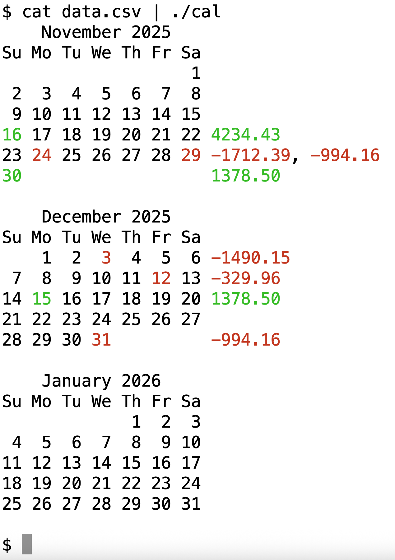 22 fmt.Print(calMonth(start.AddDate(0, 1, 0), dayMap), "\n")